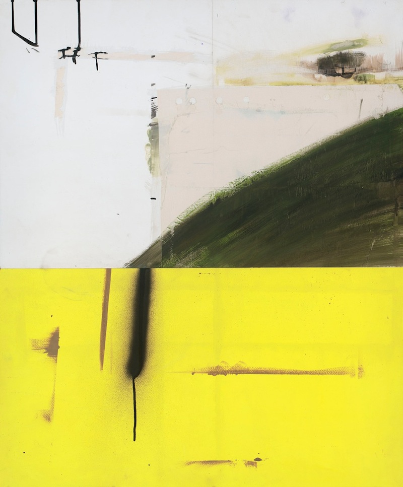An explosion of colours emanate from his canvas, an assortment of dimensional shapes in a semi-organised, sometimes wild distribution. The work is to be read with regards to its rupture: juxtaposing flat coloured surfaces with more random patterns, his practice is a pleasing marriage of spatial control and graphic instinct. The fluidity of the brushstrokes is tamed by an imposing quadratic layout, both free and constrained shapes, in a mixed print collage. The notion of absence seems to be engraved into the pictographic fundamentals, but without an air of dominance; it circulates between the lines, the planes and perspectives, plays with the balance between white and shades, the voids and the plentiful. “The mass of colours lean towards one another, displace the gaze whilst directing their own elsewhere. The artist sketches these lines, obscures and obliterates their features in a serial elaboration of what lies out of focus, the other, what falls outside, endowing a significance to an overflow of colour now absent, disappeared but still pregnant with a private force” explains Sally Bonn, art critic. A figurative absence but with gesture acknowledged: the viewer is carried away by the dialectic between vision and space that penetrates these abstract landscapes. //