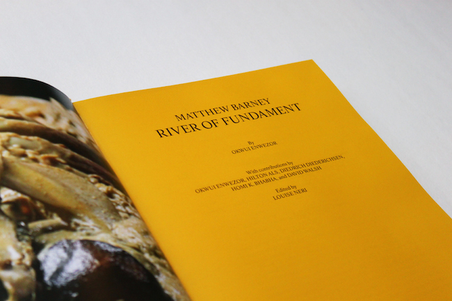 La maison d’édition Skira Rizzoli signe un ouvrage remarquablement sobre et graphique, où l’édition reflète la narration de Barney. River of Fundament s’ajoute au catalogue déjà bien fourni de la grande maison d’édition new-yorkaise : Ryan McGinley, Olafur Eliasson, Richard Serra… Ici, l’éditeur offre un objet d’un format assez grand dont le découpage et les jeux de papiers, de formats et de livrets, traduisent avec excellence la narration schématisée de River of Fundament où la mise en abyme est omniprésente. Il reprend aussi la construction schématique et clinique de l’artiste dont les précédents ouvrages — Cremaster notamment — et les sites internet dédiés sont imprégnés.