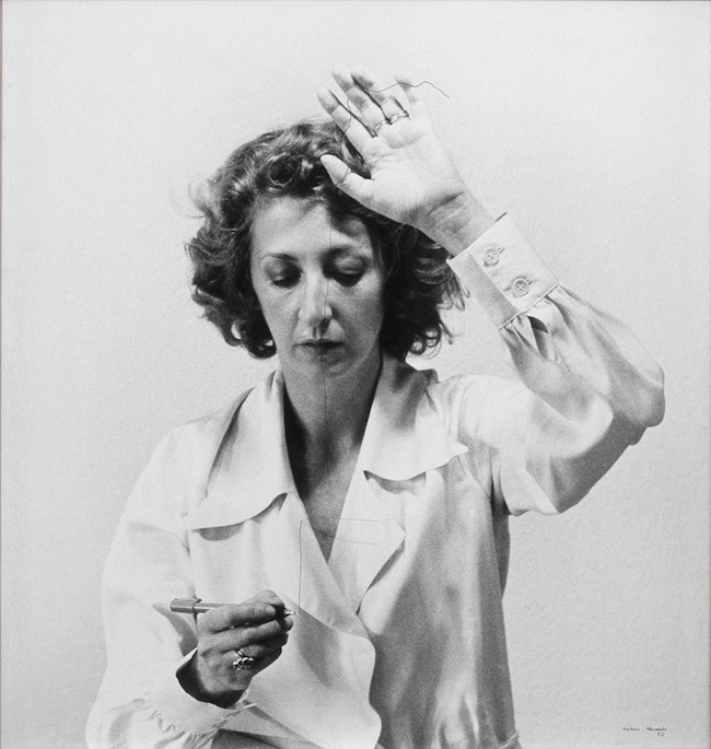 - © Desenho habitado [Dessin habité], 1975, Helena Almeida, Photographie noir et blanc, encre indienne, crin de cheval, 60 × 55 cm. Coll. Museu Nacional de Arte Contemporânea – Museu do Chiado, Lisbonne. Photo Mário Valente, courtesy MNAC – Museu do Chiado, Lisbonne