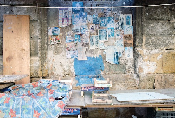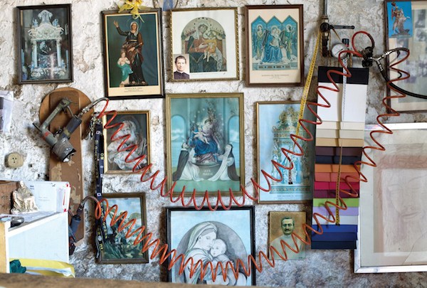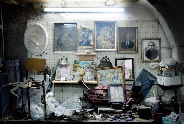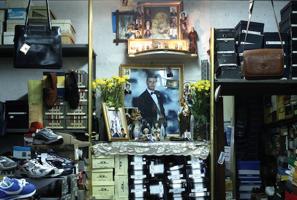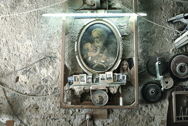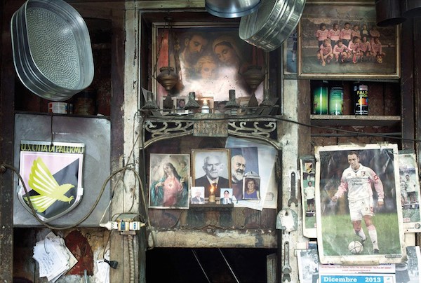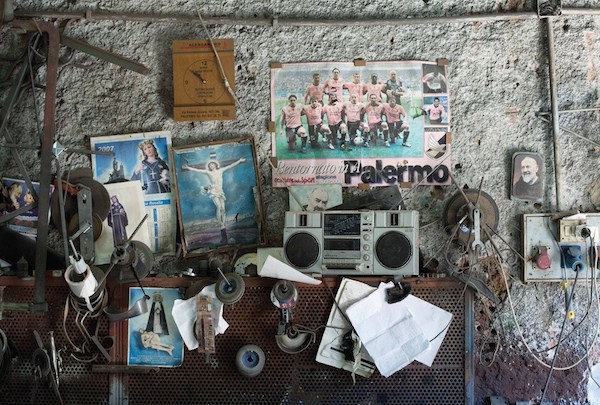 Dans les garages, ateliers et boutiques des habitants de la ville de Palerme en Italie, Emma Grosbois a capturé les réminiscences de rites religieux. L’artiste française a photographié les autels et les patchworks d’images sacrées et profanes qui habitent les intérieurs de certains des Siciliens de la ville. Saints, footballeurs, Vierge à l’Enfant, photos de famille et portraits de personnalités politiques cohabitent sur un même plan. Dans le brassage désordonné de ces chapelles domestiques, l’aura de ces images semble avoir traversé le temps.