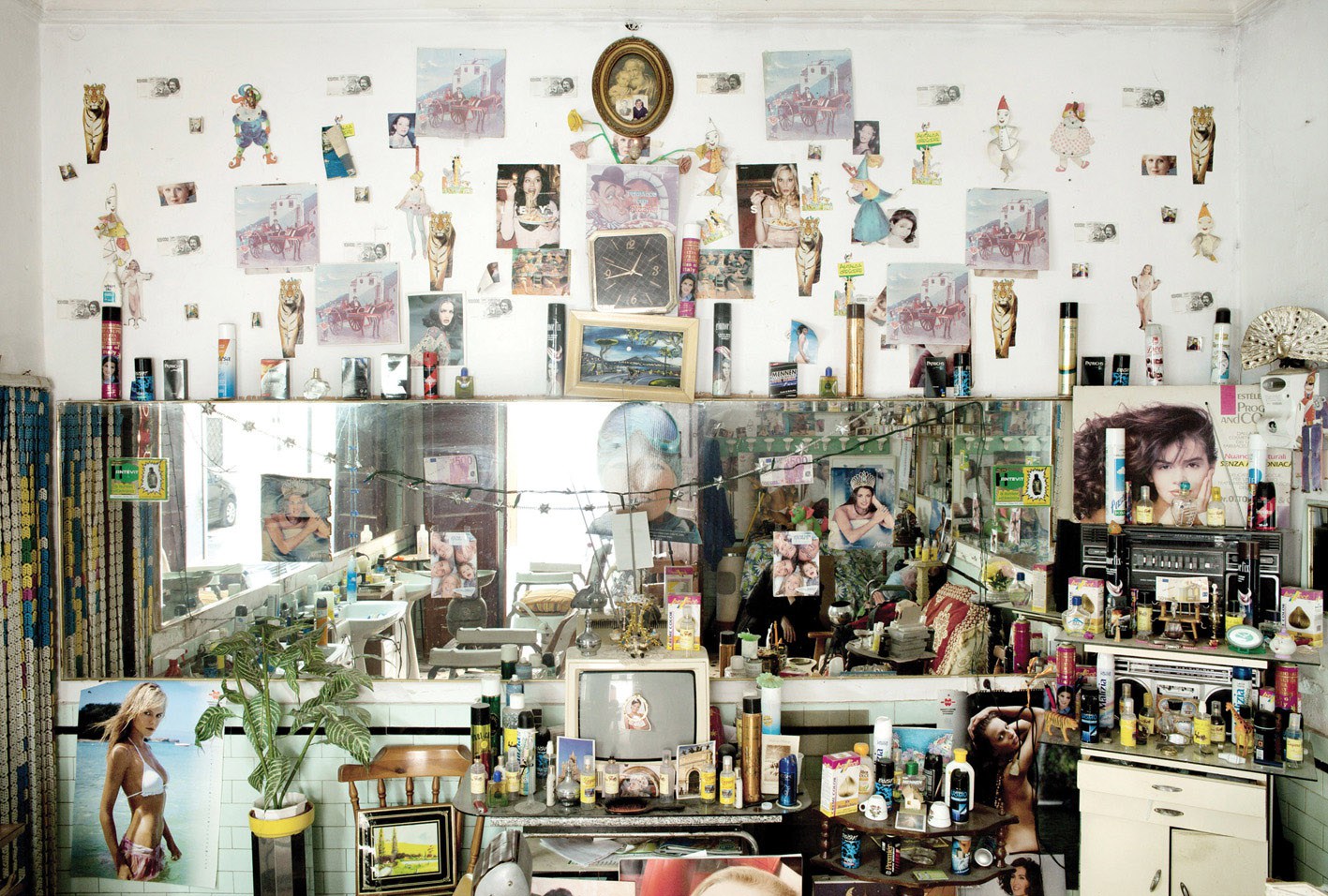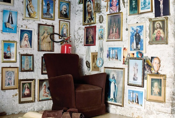 Élevées les unes au-dessus des autres, ces images prennent leur force par ce que raconte l’organicité de leur assemblage. Toutes ces figures iconiques, assemblées pêle-mêle sur un même plan, sont le glossaire iconographique de leurs habitants. Ainsi, on s’éloigne de l’unicité mystique de l’icône religieuse isolée dans un coin de séjour, pour faire face au medley populaire et profane d’images qui sont le portrait des absents de la photographie – à savoir – les habitants.