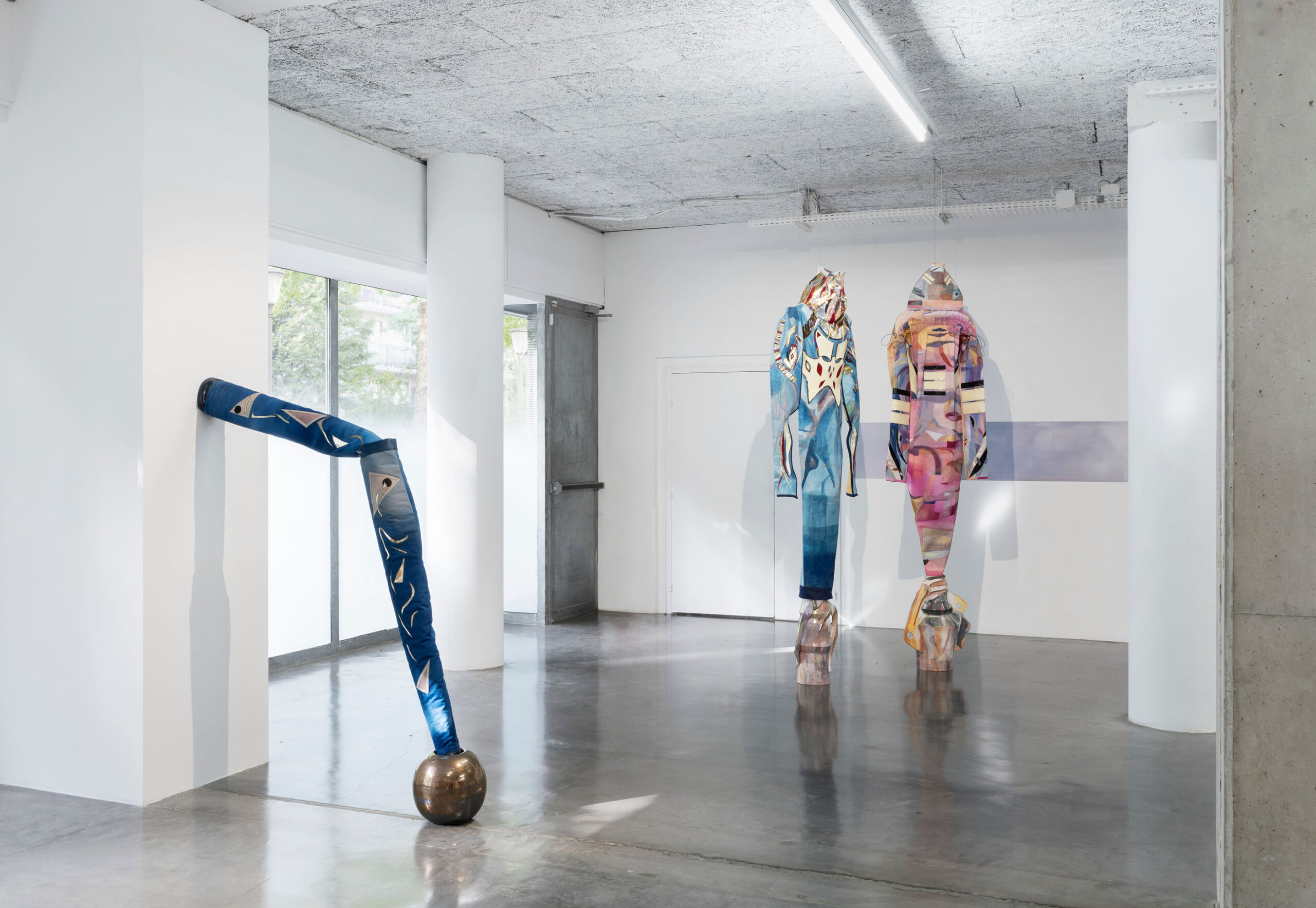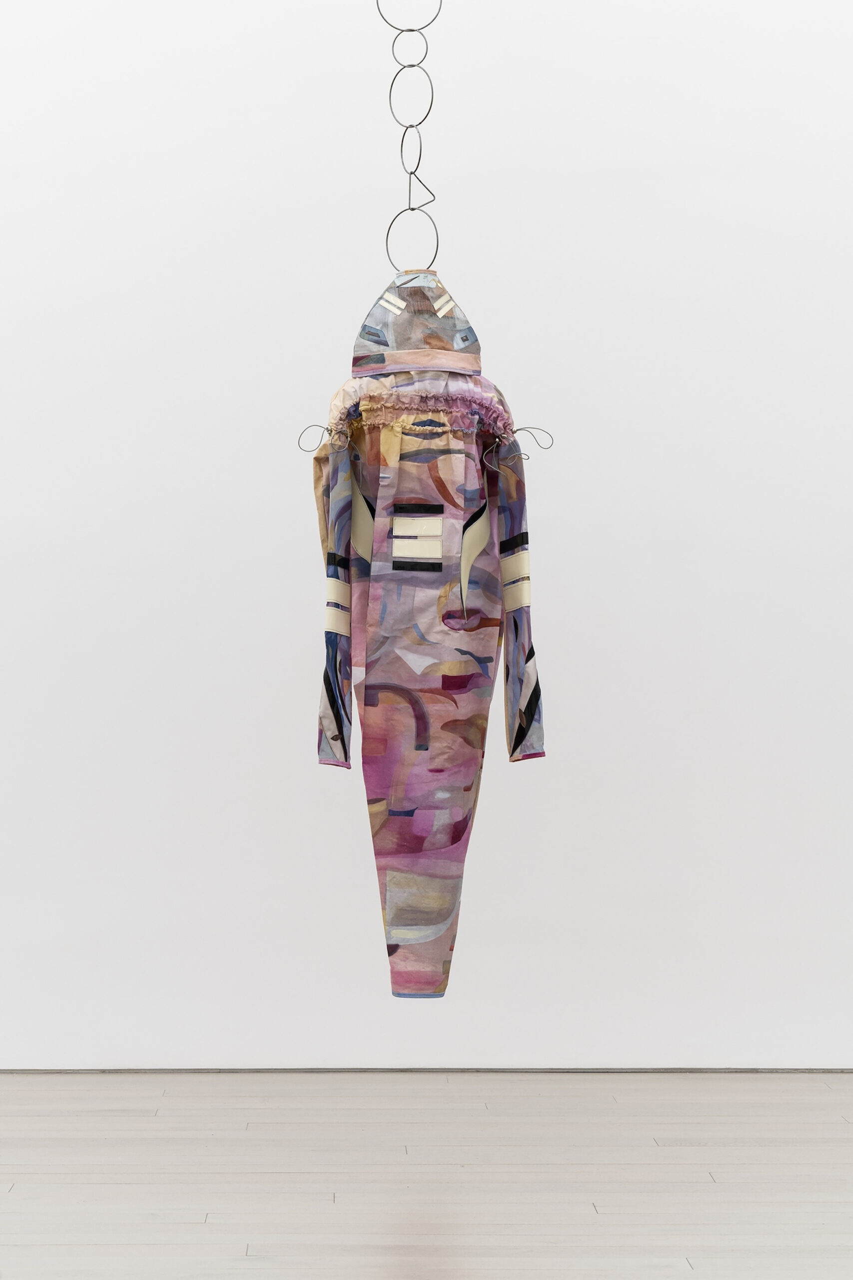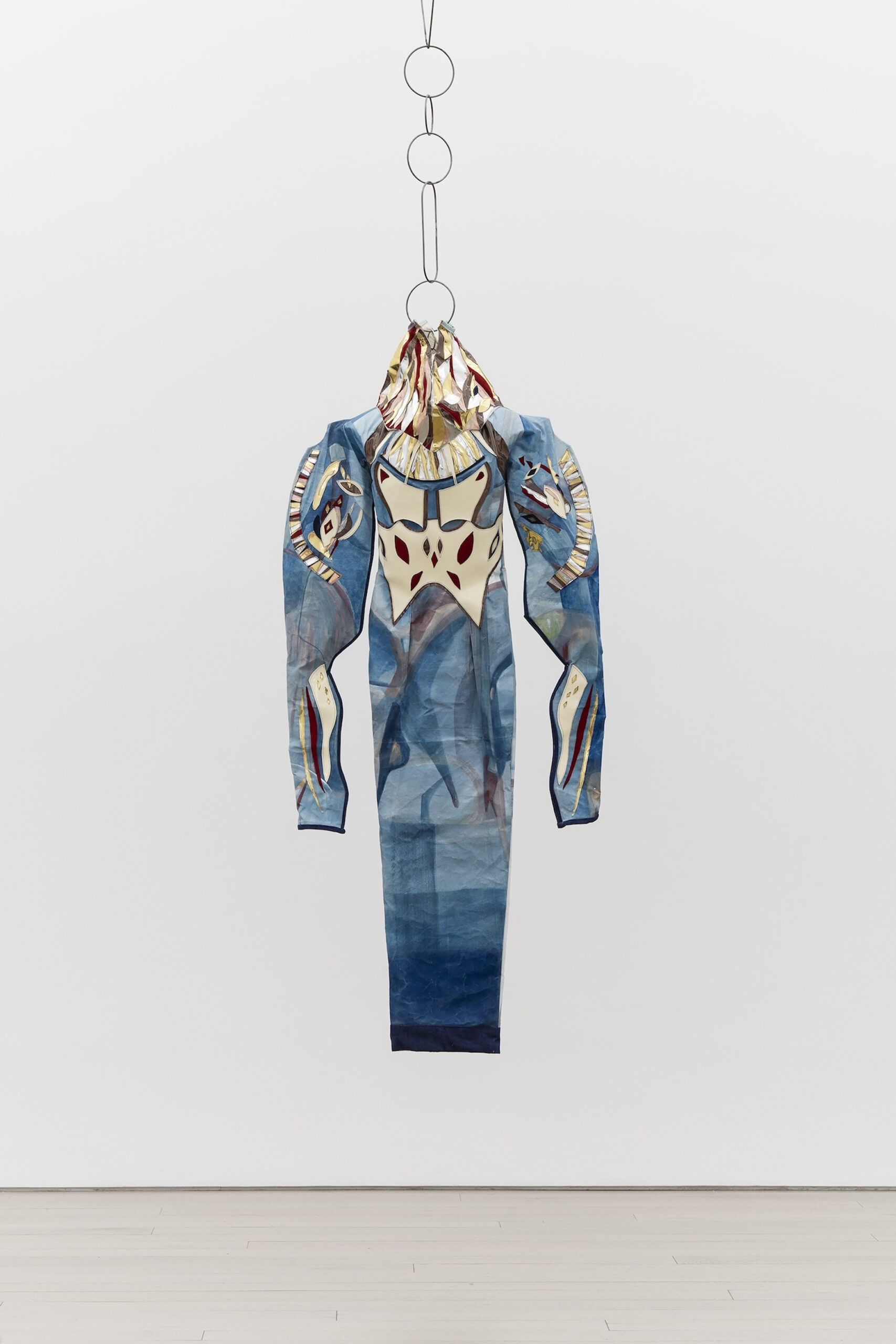 Mathilde Denize, Sound of Figure, 2024, acrylique et aquarelle sur toile, cuir, vinyle, daim, jean, kraft, métal, 207 × 58 × 33 cm. Photo : Guillaume Zicarelli © Mathilde Denize / ADAGP, Paris, 2025. Courtesy de l’artiste et de Perrotin.