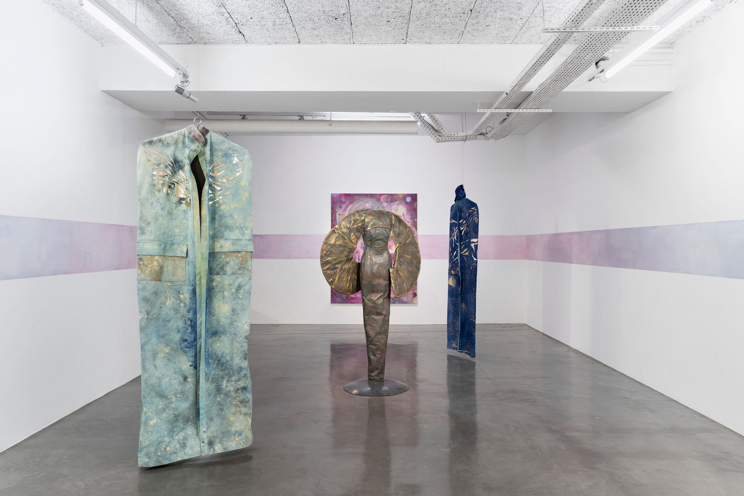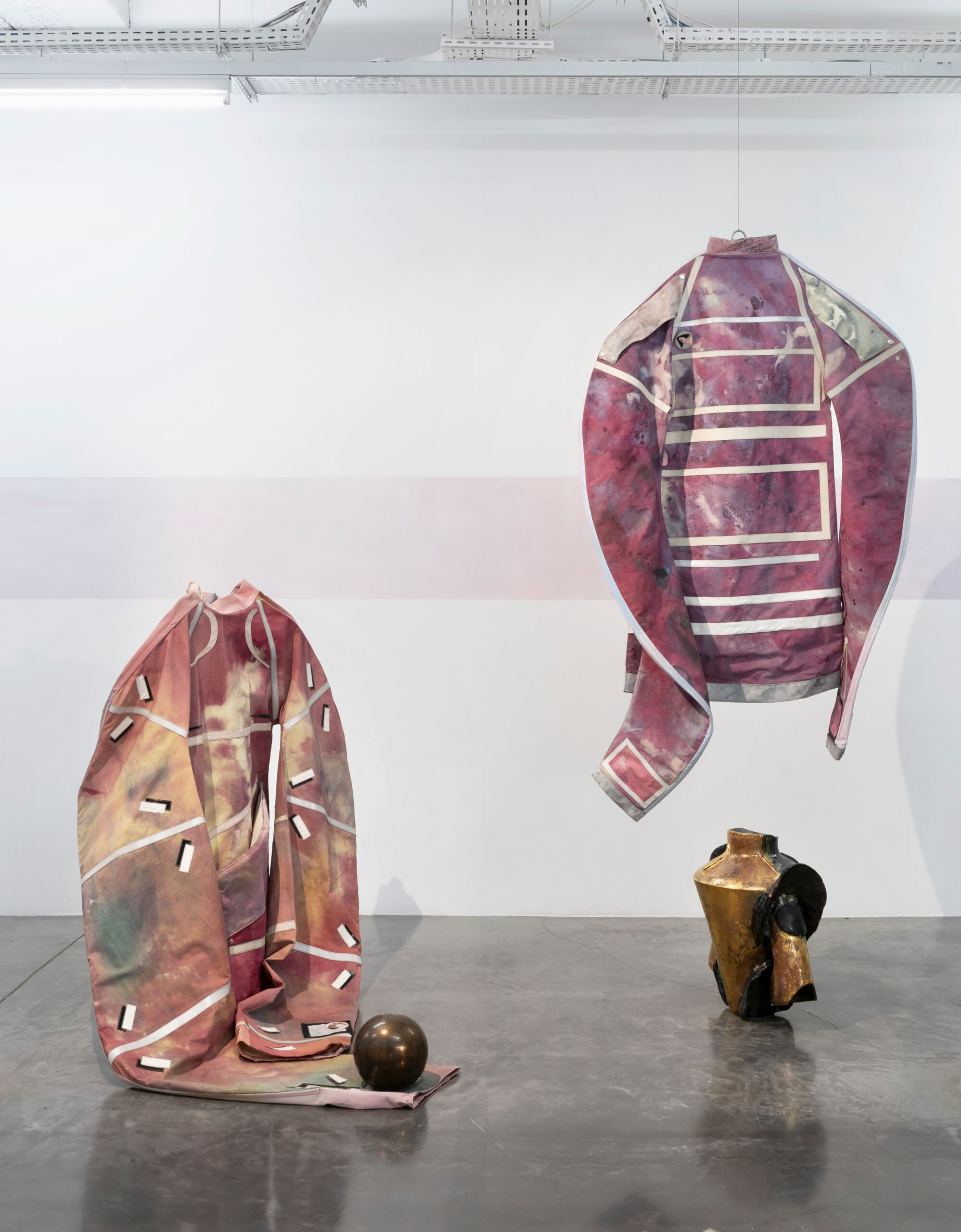 En créant des costumes à partir des toiles qui portent cet insaisissable, l’artiste trouve un moyen d’échapper à la planéité retorse de la peinture. Telles les enveloppes d’invisibles passe-murailles — certains s’y fondent ou en émergent, d’autres font la ronde, pendus à des cintres, évoquant les Aveugles de Brueghel, d’autres encore, rappelant la robe de chambre du Balzac de Rodin —, les œuvres ramènent à cette hantise d’une apparition qui échappe, d’une image non réalisable. Où l’impossibilité de peindre revient tout de même à la peinture, ou à la sculpture. C’est aussi le sens de son film tourné à la Villa Médicis en 2021, ici entrecoupé de séquences prises au téléphone, le tout flouté, comme si les personnages et formes fantomatiques en étaient vus à travers des yeux clos.