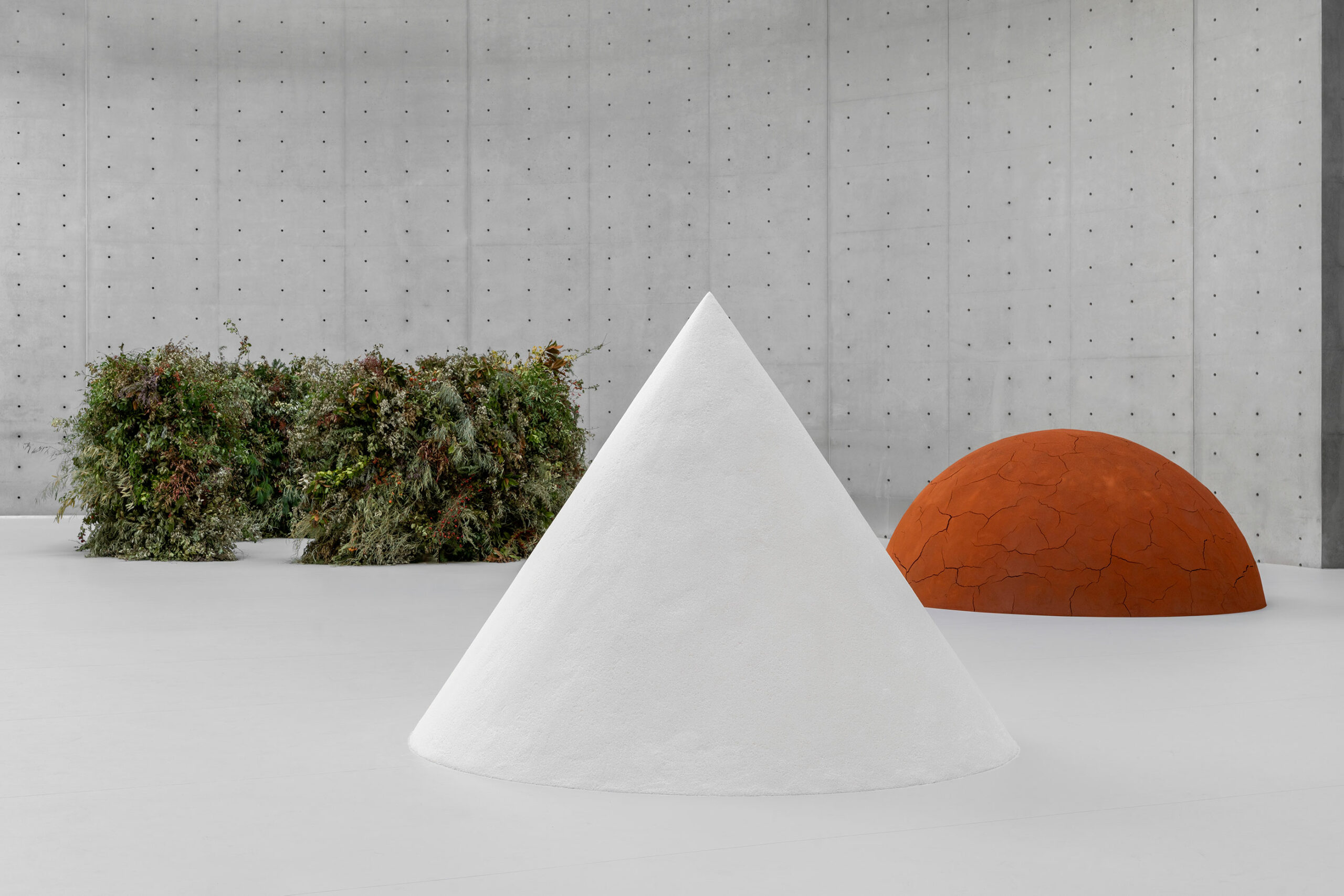 Cette symbiose entre les œuvres et l’architecture de Tadao Ando est plus qu’évidente dans la Rotonde, où l’installation monumentale de Meg Webster (née en 1944) trouve une place si juste qu’elle se mesure à l’échelle de tout le bâtiment. Dans cette vaste arène ceinturée de béton brut, ouverte vers le ciel que filtre la majestueuse coupole, l’artiste américaine a fait entrer de la terre, du sable, du sel et de la cire d’abeille, des branchages et des fleurs. Rien que des matières naturelles, disponibles localement, qu’elle est venue compacter en figures élémentaires (dune, sphère, cône, surfaces convexes) et monochromes. L’équilibre est subtil entre simplicité et sensualité, et Webster sait très bien faire de nous, de nos sens, le vrai médium de son œuvre. Au milieu des odeurs de sous-bois, dans l’espace qui se creuse entre chaque forme pleine, quelque chose nous saisit instantanément, difficile à décrire. Comme un désir du vide, un vertige à l’envers. L’envie de goûter des yeux, de sentir la lumière.