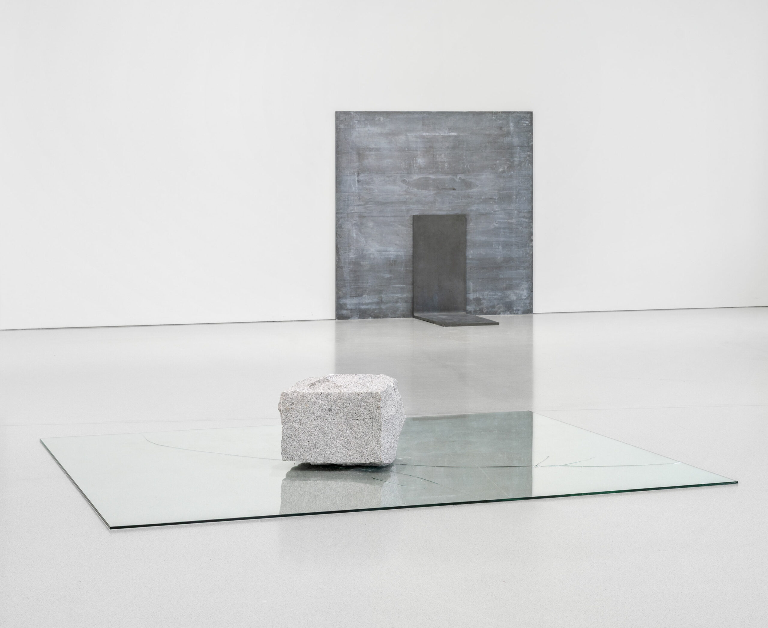 Ce parti pris ouvre bien des parentés, plus ou moins riches ou évidentes. Ainsi, deux plaques de plomb de l’américain Richard Serra (1938-2024), l’une étayée par l’autre, pliée et positionnée dans l’angle entre le mur et le sol (Right Angle Prop, 1969/1993), voisine l’œuvre du coréen Lee Ufan (né en 1936), une pierre posée sur une plaque de verre, que son poids a brisé (Relatum, 1969/2025). Si les matériaux et les gestes diffèrent, ces œuvres majeures de la Collection Pinault mettent toutes deux en scène, d’une part, les forces qui sous-tendent leur conception (celle qu’il faut pour tordre le métal, celle du choc entre la pierre et le verre) et d’autre part, les rapports qu’elles entretiennent avec leur environnement (le sol, le centre, le mur ou le recoin).