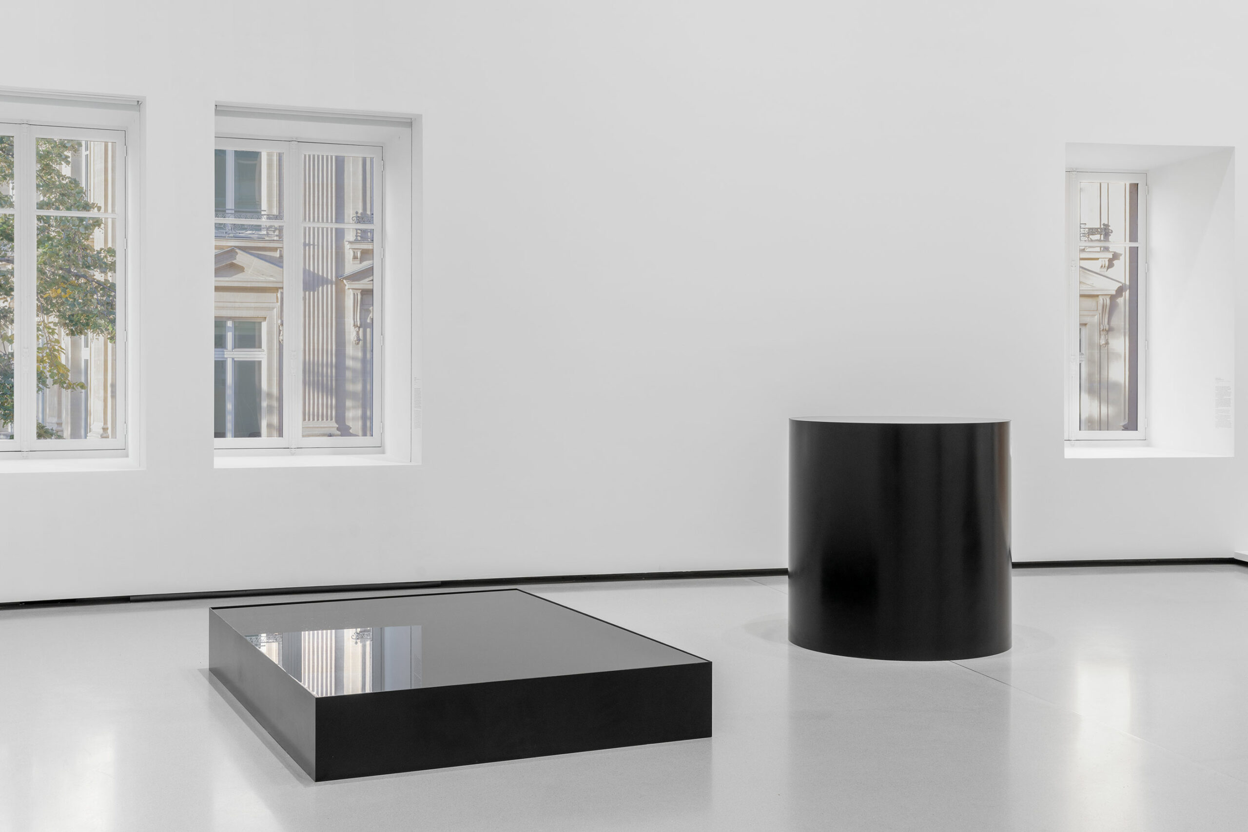 Nobuo Sekine, Phase of Nothingness – Water, 1969/2012, acier, laque, eau, 120 × 120 cm (cylindre), 30 × 220 × 160 cm (bloc), Pinault Collection. © Nobuo Sekine Estate. Vue de l’exposition « Minimal », Bourse de Commerce – Pinault Collection, Paris, 2025. © Tadao Ando Architect & Associates, Niney et Marca Architectes, agence Pierre-Antoine Gatier. Photo : Nicolas Brasseur.