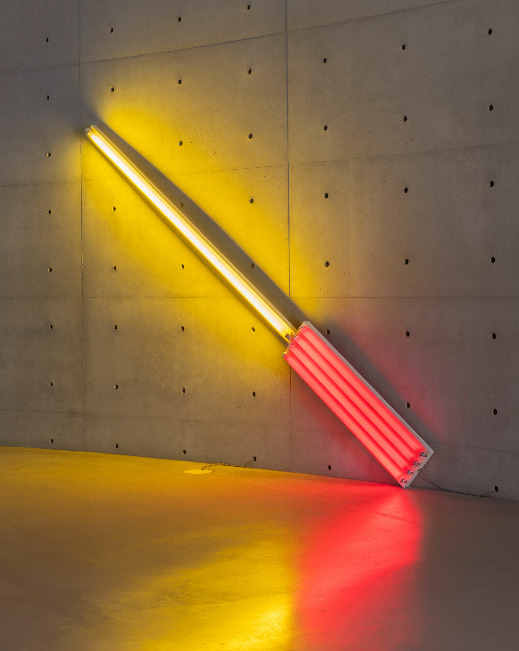 Dan Flavin, Alternate Diagonals of March 2, 1964 (to Don Judd), 1964, lumière fluorescente rouge et jaune, 365,8 cm (en diagonale), Pinault Collection. © Dan Flavin / Adagp, Paris, 2025. Vue de l’exposition « Minimal », Bourse de Commerce – Pinault Collection, Paris, 2025. © Tadao Ando Architect & Associates, Niney et Marca Architectes, agence Pierre-Antoine Gatier. Photo : Nicolas Brasseur.