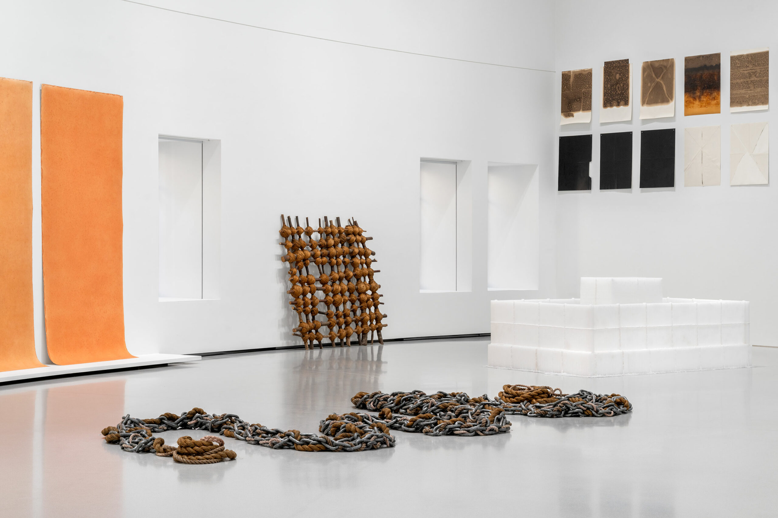 Vue de l’exposition « Minimal », Bourse de Commerce – Pinault Collection, Paris, 2025. Avec les œuvres de Michelle Stuart, Maren Hassinger, Jackie Winsor, Dorothea Rockburne et Kishio Suga. © Tadao Ando Architect & Associates, Niney et Marca Architectes, agence Pierre-Antoine Gatier. Photo : Nicolas Brasseur.