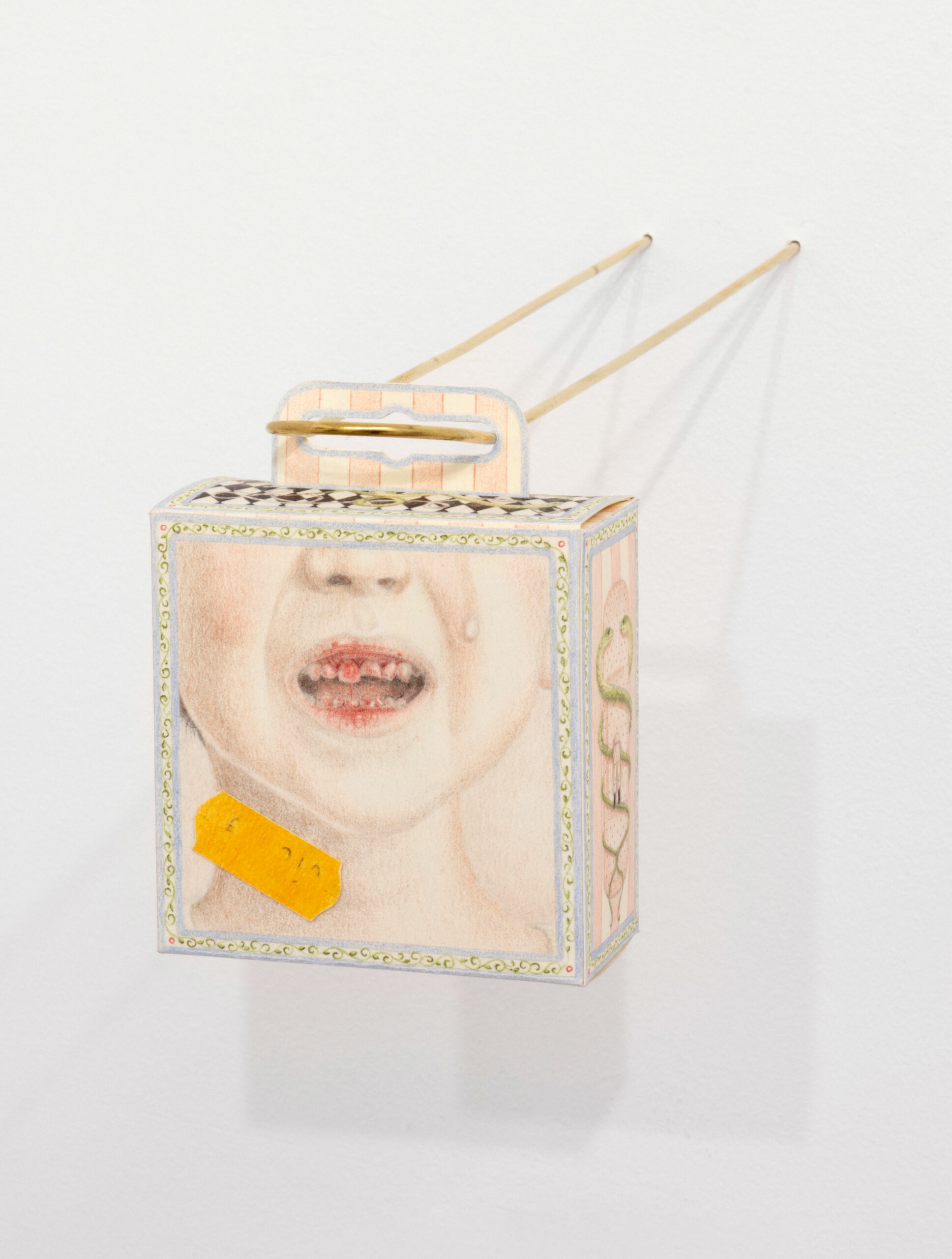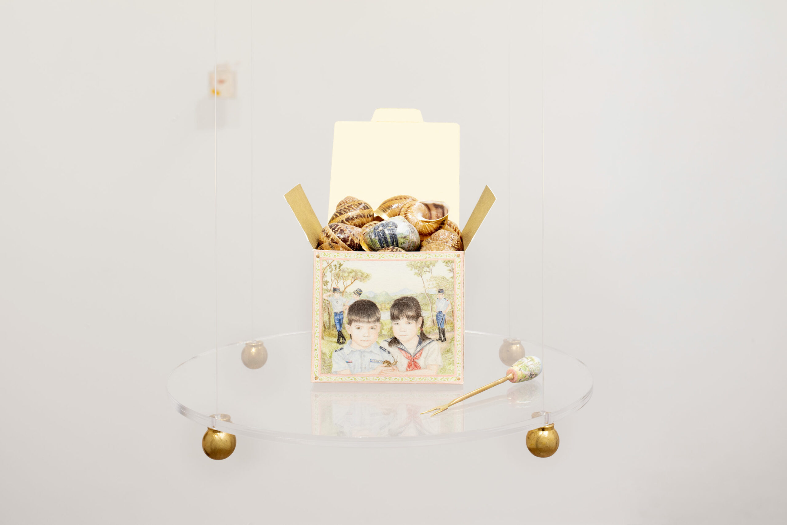 Mathieu Santori, Dévore-moi la bave aux lèvres, 2025, crayons de couleur sur boîte en papier, coquilles de petit-gris, vernis, feuille d’or, 14 × 9 × 8,5 cm. Photo : Benoit Fougeirol. Courtesy de l’artiste et de la galerie Suzanne Tarasieve.