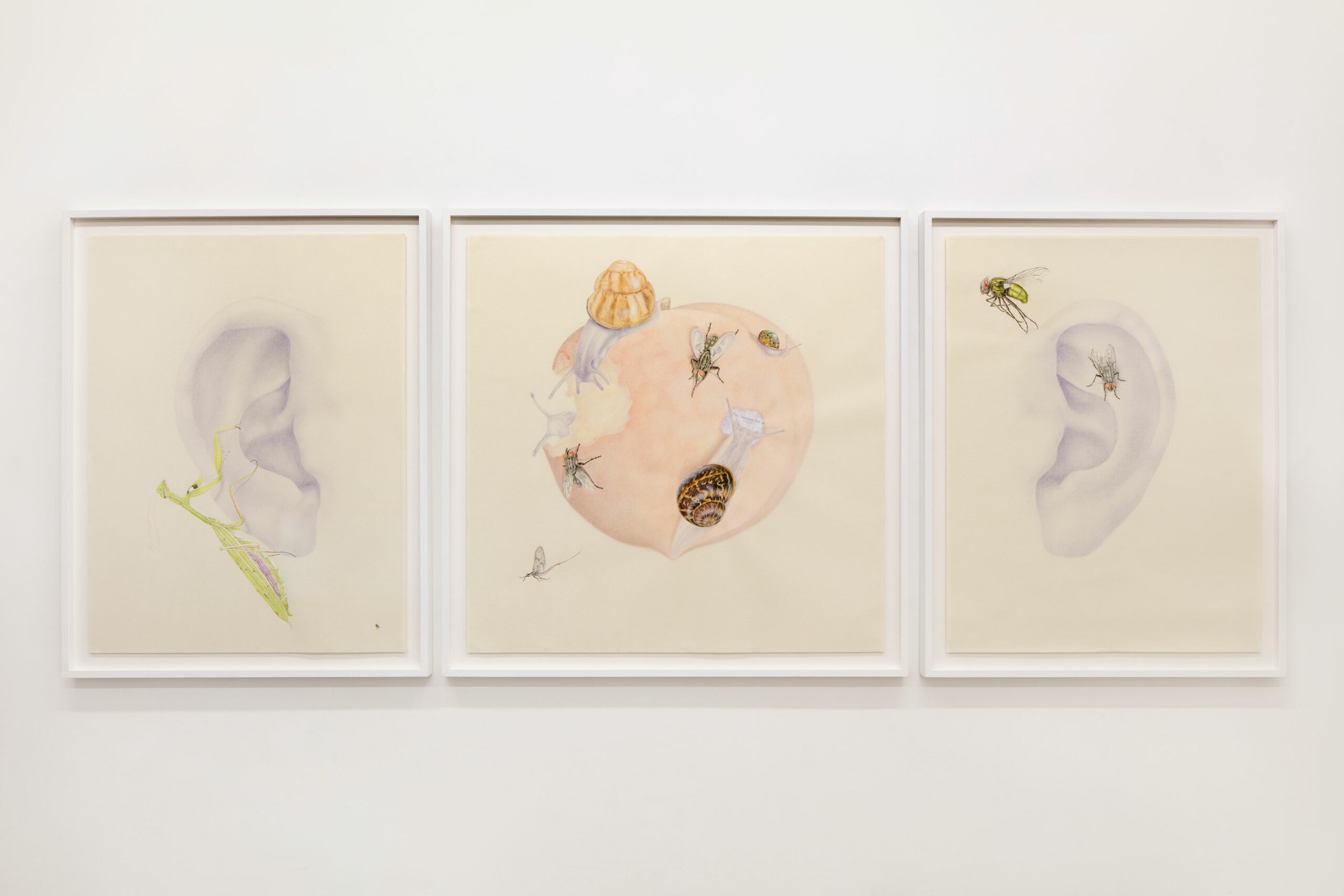 Présenté telle une boîte de chocolat, suspendue par quatre fils, Dévore-moi la bave aux lèvres (2025) présente à la vue des visiteurs un monticule d’escargots aux coquilles vernies et lustrées. Mathieu Santori s’est amusé à en reprendre le patron, à en reproduire l’intérieur doré et la préciosité des illustrations. Sur la face avant : un duo d’enfants à la lisière d’une forêt, où, en arrière-plan, trois militaires conversent au repos. La scène est intrigante, sujette à interprétations. L’artiste est vêtu d’une tenue d’été de sous-officier de la gendarmerie nationale héritée de son père et de son grand-père, sa sœur d’un uniforme d’écolière japonaise. Sur la face arrière : le rapport de domination avec l’animal est inversé, ce sont les humains qui sont voués à la merci du bon vouloir capricieux de ceux qui les observent. Plus loin, l’allégorie de la boîte de Pandore mêle l’opulence à la luxure (Tu ouvriras tes yeux et j’ouvrirai mes jambes, 2025). Un sexe de femme laisse sortir de sa béance une colonie d’escargots. C’est le génie créateur de la mère qui enfante la nature. Mais aussi une évocation de la folie érotique du Rêve de la femme du pêcheur (1814) d’Hokusai et la frontalité des images pornographiques. Pour le décor paysager, on pense aux peintres de la Renaissance flamande et italienne, à l’arrière-plan architectural et végétal de la Vierge au Chancelier Rolin de Van Eyck (1430-1435), à la ligne sinueuse de l’Arno figurée au-dessus du buste de la Joconde (1503). Toutes les influences classiques et populaires, picturales et symboliques du dessinateur sont ici convoquées.