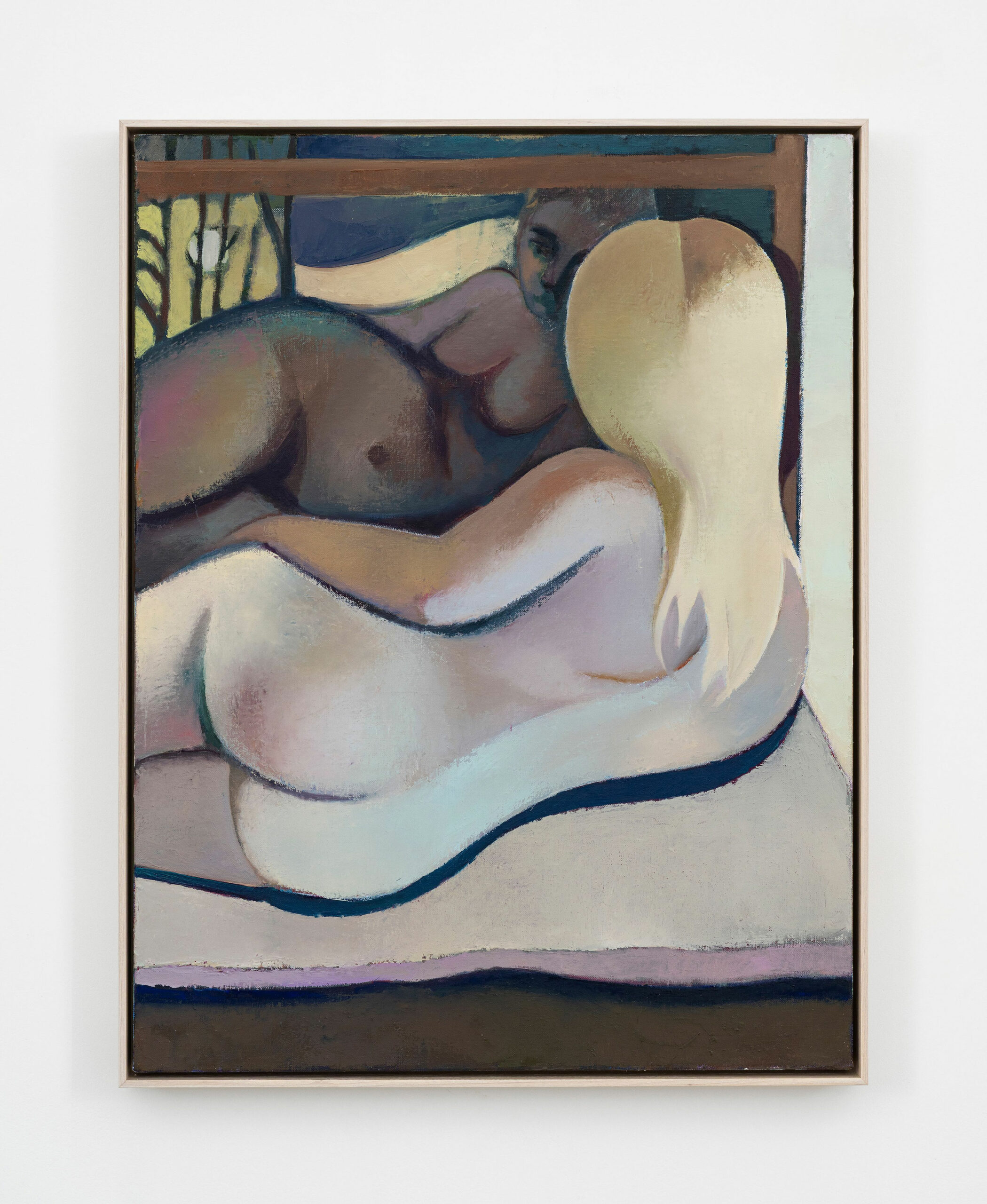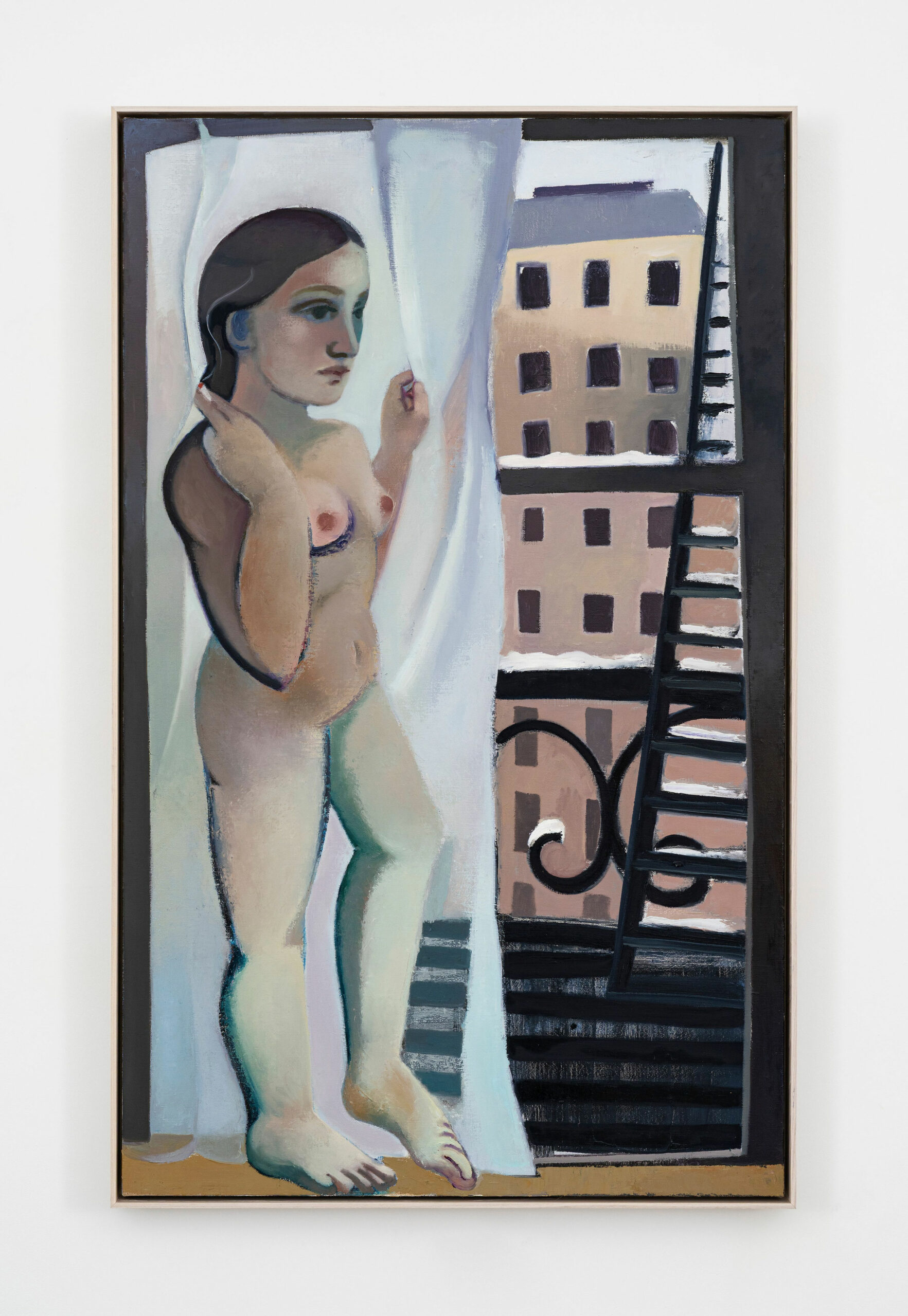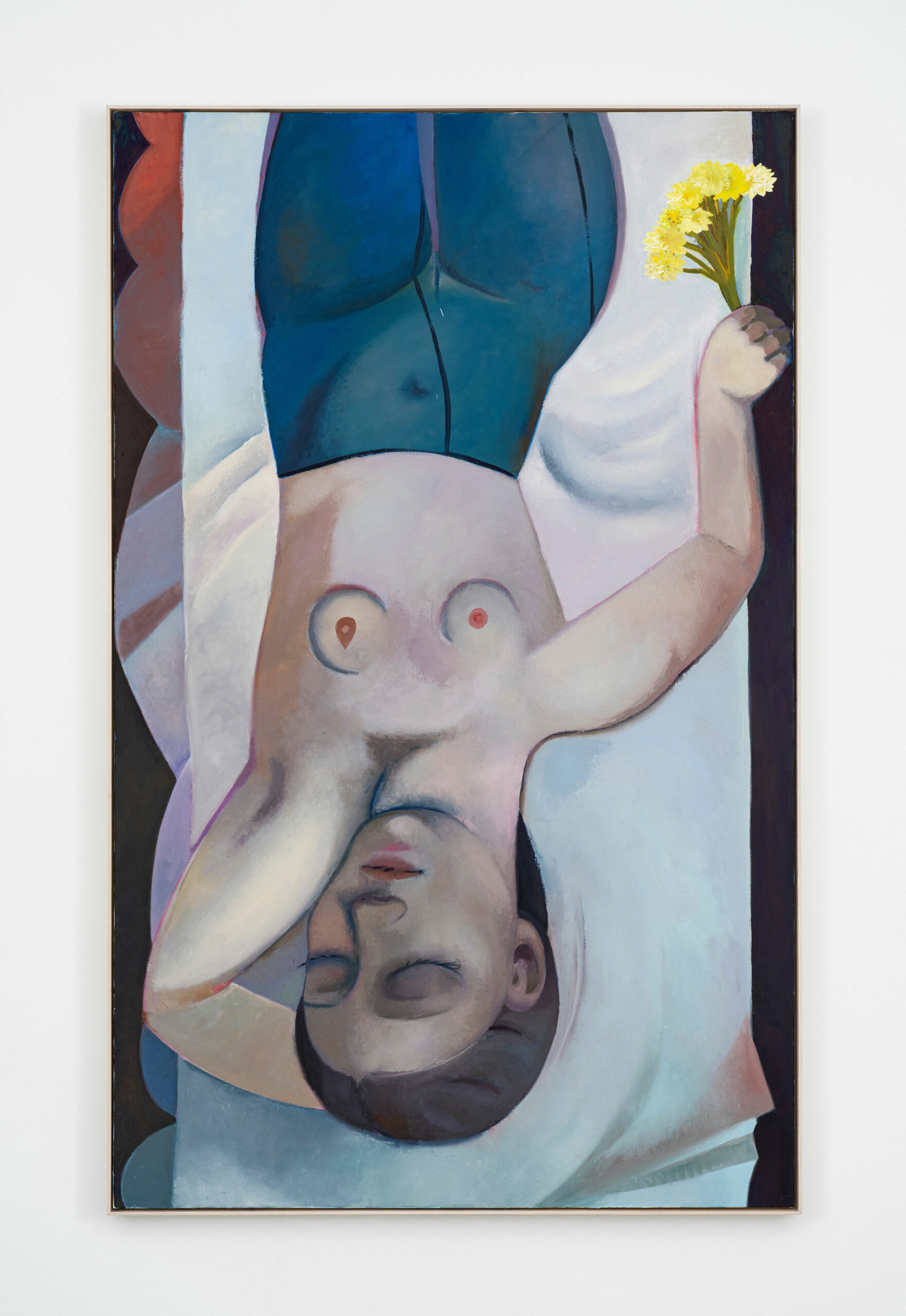 Winter (2025), Escape (2026) et Bachelorette (2026) évoquent le fait que rien n’est complètement résolu. Winter est sans doute la toile la plus sombre de l’exposition : une femme seule allongée dans des tons de brun et de bleu nuit. Escape montre une figure nue debout face à une fenêtre ouverte sur une ville géométrique. Bachelorette inverse la gravité : une femme tête en bas, tenant un bouquet de fleurs jaunes, les yeux fermés, le corps vulnérable et pourtant libre. Le repli et la solitude n’ont pas disparu du travail d’Orchard mais ne sont plus son seul horizon.