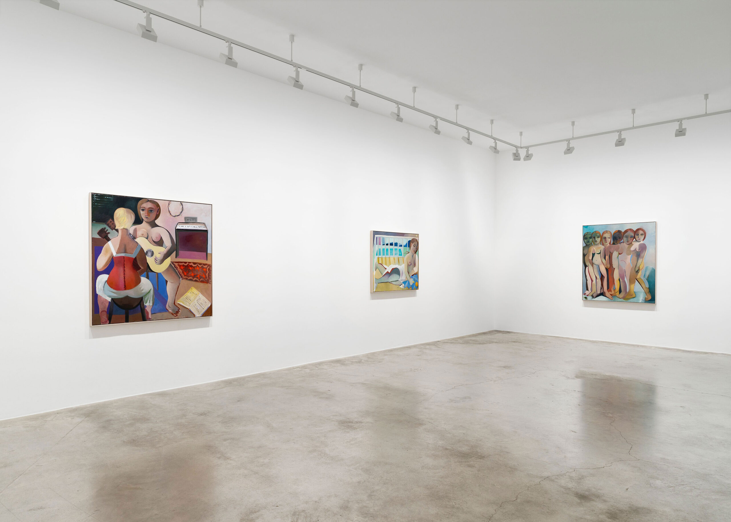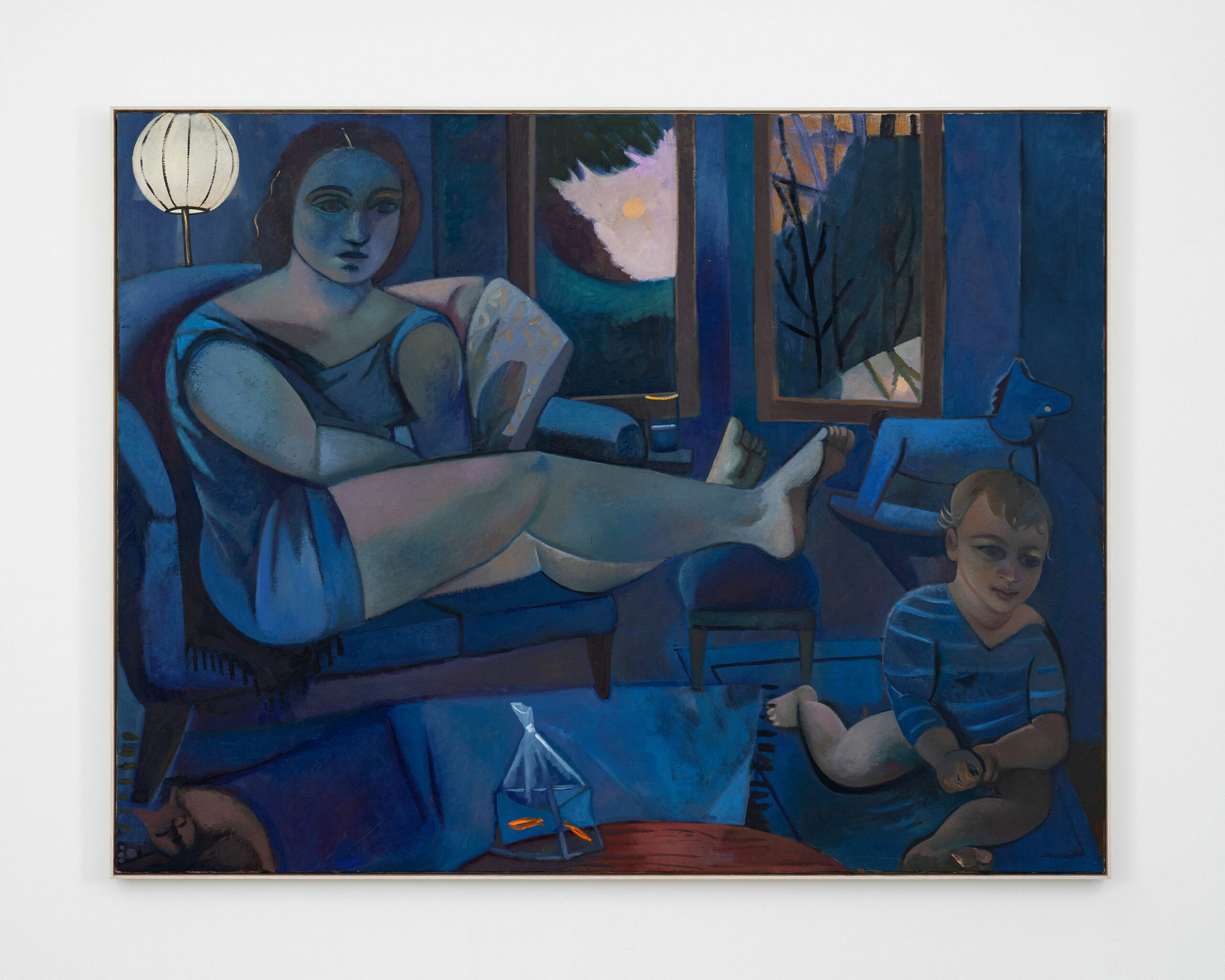 Dans Goldfish (2025), une femme est assise dans un fauteuil, jambes croisées, tandis qu’un enfant joue seul au sol, qu’un chat dort et que la lune apparaît à la fenêtre. Le bleu envahit tout. La scène dit une maternité ordinaire, sans idéalisation ni drame, avec cette coexistence étrange de deux êtres dans le même espace, chacun dans son monde, une fois la nuit tombée. Frieze I (2026) lui répond depuis une autre salle. Cinq figures debout, vues de dos, ont les pieds dans une eau peu profonde. Danielle Orchard s’est inspirée des bas-reliefs du musée archéologique d’Athènes, de cette manière qu’ont les sculptures antiques de maintenir une présence individuelle dans la masse. Elle en propose une autre version, vue de face, plaçant le visiteur dans la position de quelqu’un qui tourne autour d’une frise, qui cherche le bon angle. Là où Goldfish montre la solitude au sein du lien, Frieze I montre le lien au sein du groupe.
