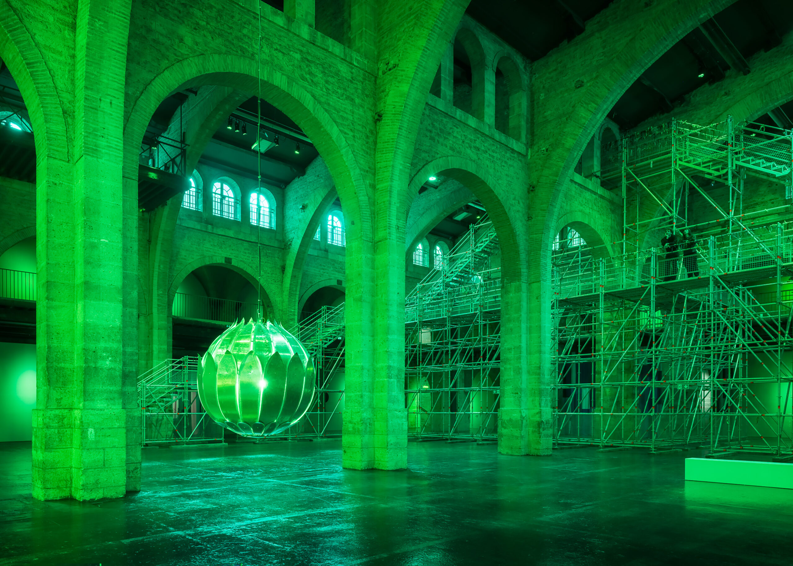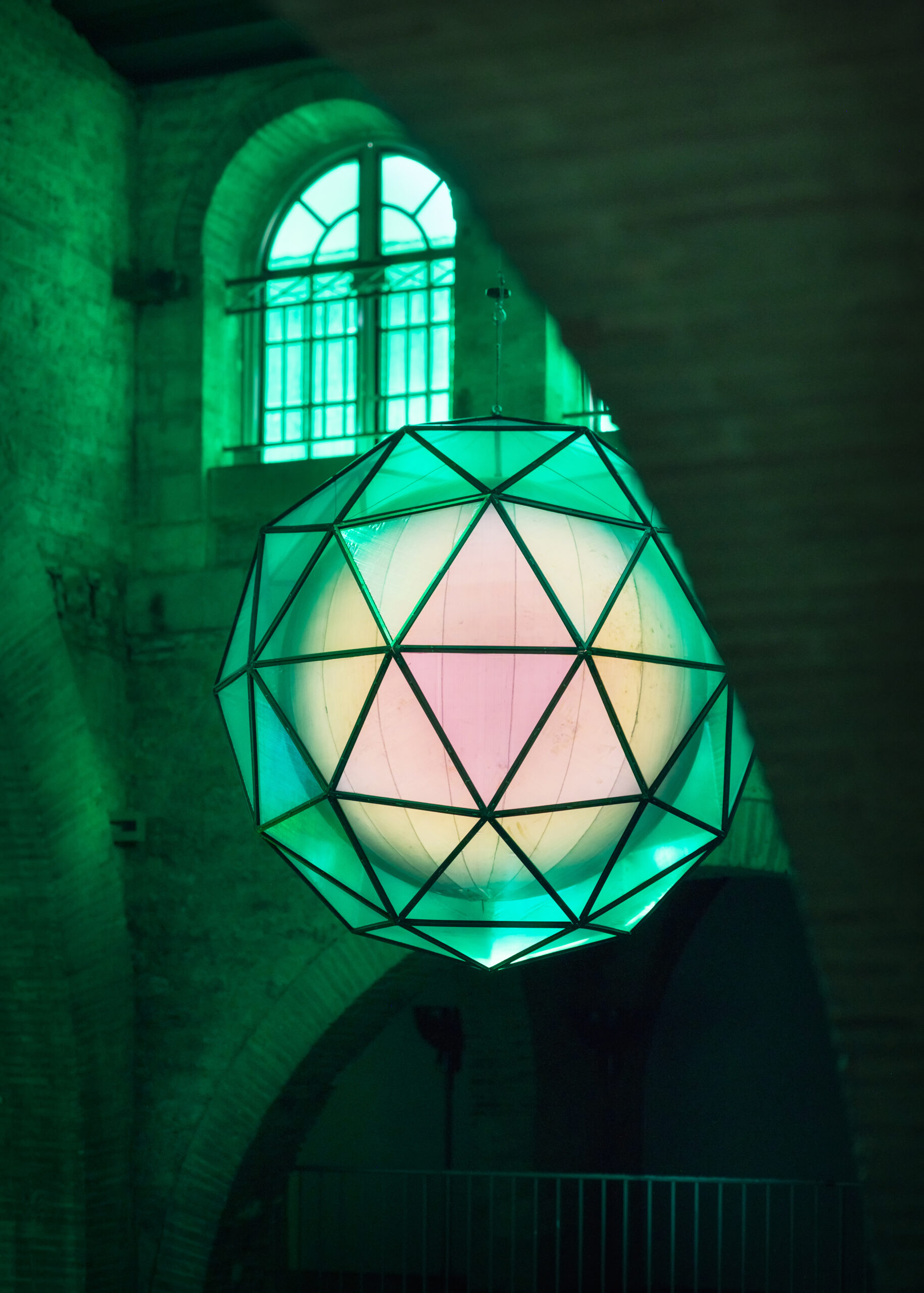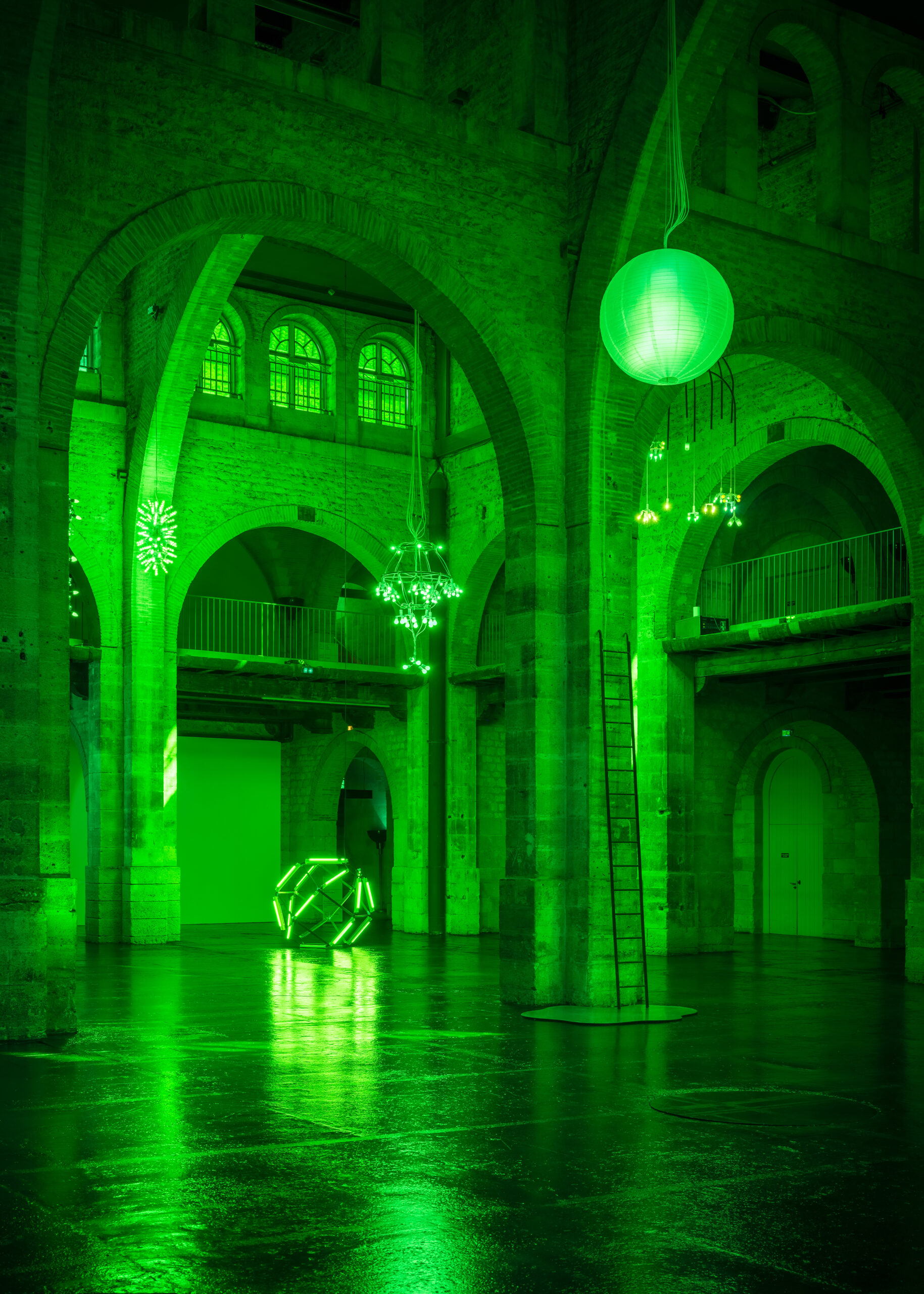 Au cœur de la nef trône Rainbow Ribboned Bridge, une structure en échafaudage en forme de double arche que les visiteurs sont invités à gravir. À l’entrée, on reçoit un ruban (une couleur différente chaque jour) à nouer sur la structure, qui s’habille ainsi, au fil des semaines, des vœux de ceux qui la traversent. Des clochettes y sont suspendues : elles signalent la présence des corps, et couvrent discrètement le bruit mécanique de l’installation. En montant, l’exposition se recompose. Les neuf soleils, les Green Chaotic Suns, chandeliers de structures métalliques hérissées d’ampoules suspendus dans la nef, se regardent autrement depuis la hauteur. La lune (Passive Moon), ballon enfermé dans une armature géodésique, flotte à l’angle opposé et ne s’illumine que si on la pointe avec une lampe torche : la lumière ne vient pas d’elle, elle la reçoit et la renvoie. Le commissaire Cédric Fauq formule la chose ainsi : c’est comme si les soleils étaient saisis dans l’instant de leur chute, un moment supposément éphémère rendu permanent, constamment en train de disparaître.