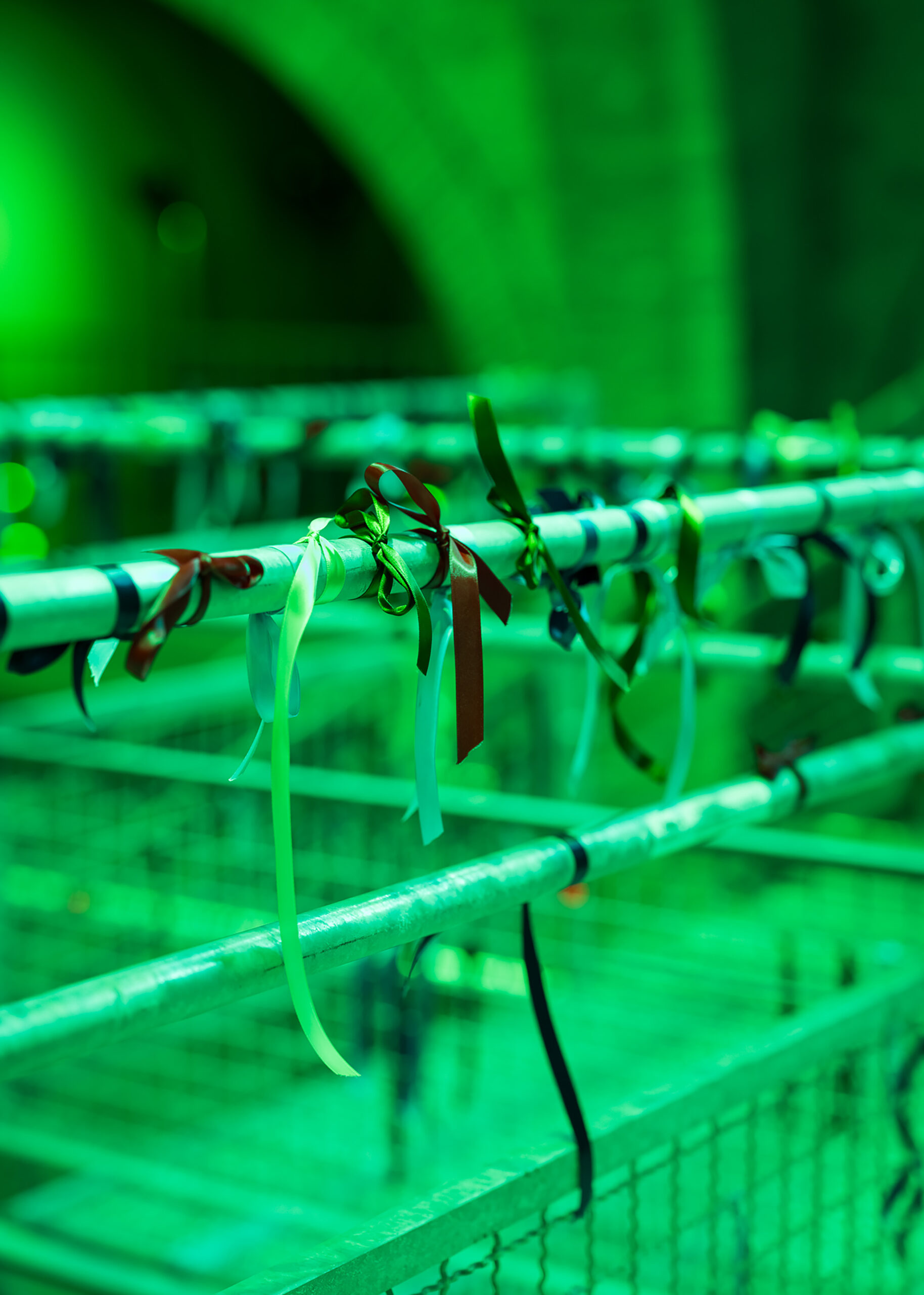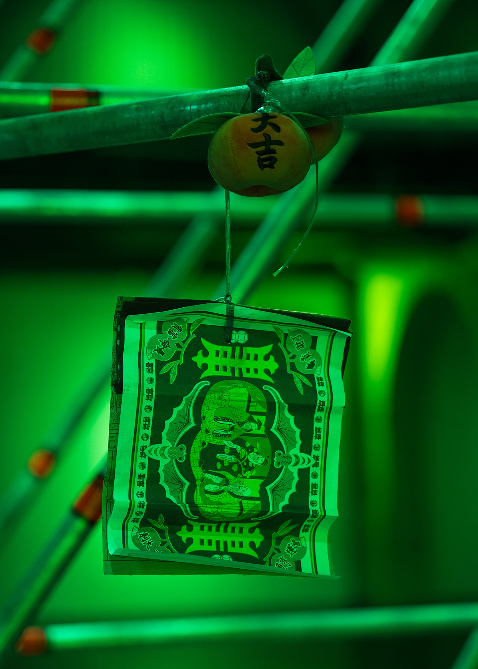 Toute la nef baigne dans une lumière verte, froide et enveloppante, qui neutralise les autres couleurs et transforme l’espace en quelque chose d’indéfinissable. Trevor Yeung en explique l’origine lors de la visite : il a découvert cette lumière dans les réserves d’un musée à Marseille, où un appareil appelé insectron l’utilise pour attirer et éliminer les insectes sans exposer les œuvres aux rayons UV. « Le vert attire les insectes pour les tuer, dit-il. C’est une lumière douce, supposée vous attirer vers votre mort. » Cette lumière évoque aussi le rayon vert, ce phénomène atmosphérique qui surgit à l’horizon la fraction de seconde où le soleil disparaît sous la mer, et que presque personne n’a jamais vu. Yeung pense aussi aux films d’horreur hongkongais des années 1980, où le vert servait à figurer l’effroi, à déformer les visages. Une même couleur, plusieurs cultures, plusieurs façons de faire peur.